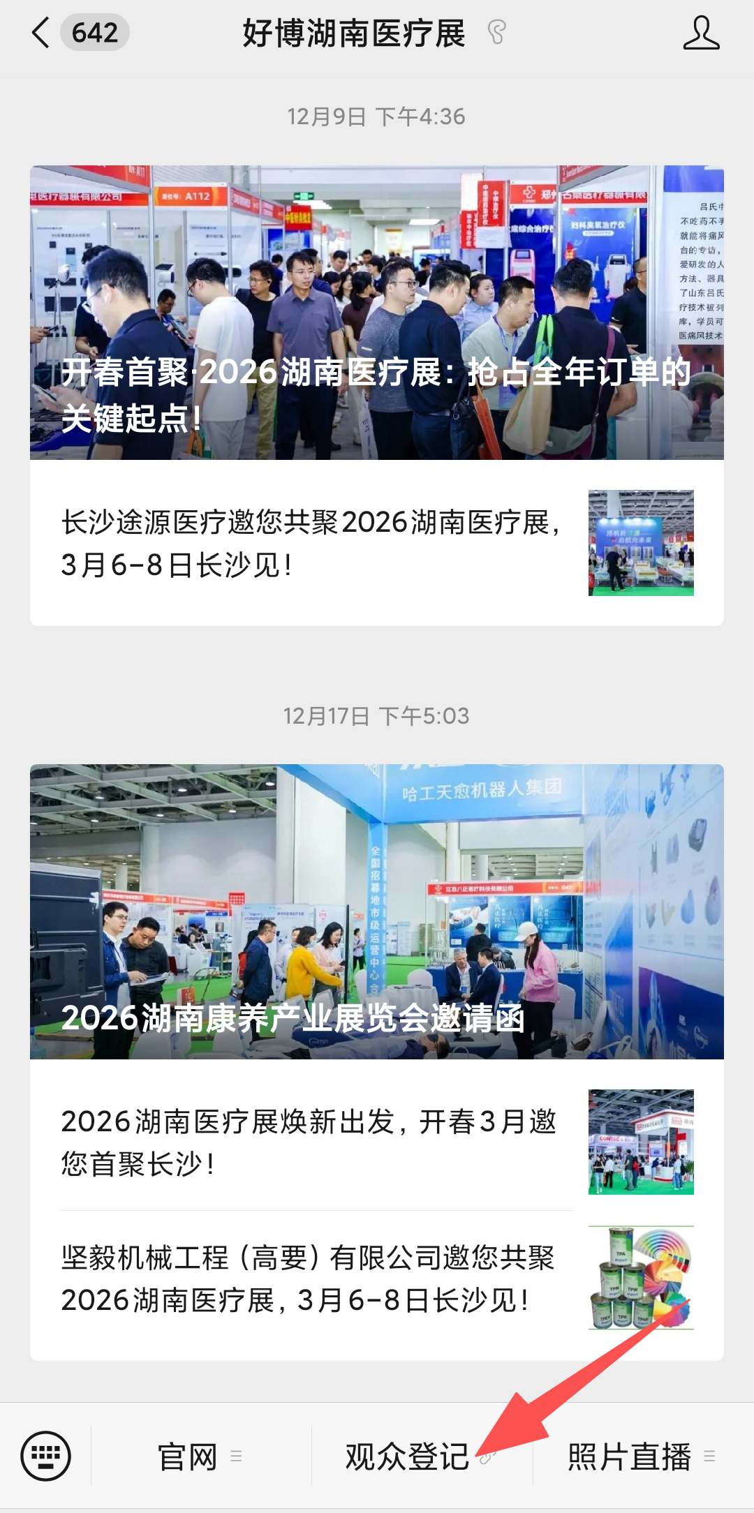 如果您有意愿参观展会,您可以在“湖南医疗展”微信公众号,进行观众登记,展会现场便捷入场。